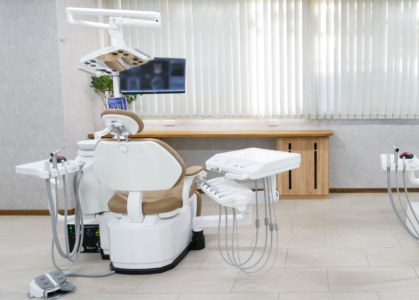 診療台にモニターを設置。動画やイラストを用いて、「目で見てわかりやすい説明」ができるように努めています。また、治療の際は痛みを軽減できる治療機器を選択し、「心身にやさしい治療」が可能です。